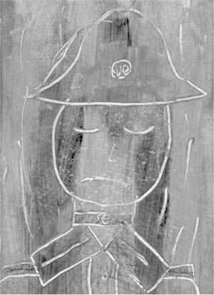 Катя Буряк (апрель, 2008), будучи 9-летней девочкой, синим, импрессионистским фоном передает впечатление внутренней напряженности уставшего солдата, стоящего на страже голубой планеты Земля, в период военной грозы и тьмы, затмивших мир.