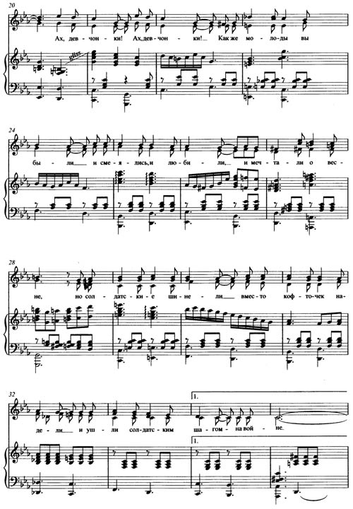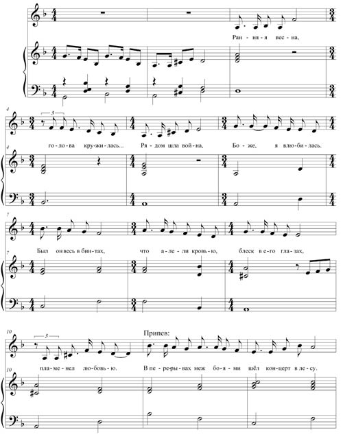 Ранняя весна,Голова кружилась.Рядом шла война,Боже, я влюбилась!Был он весь в бинтах,Что алели кровью,Блеск в его глазахПламенел любовью.Припев: В перерывах меж боямиШёл концерт в лесу.Выступала со слезами,Теребя косу.Как я пела о Катюше,О любви большой!..У бойцов светлели душиНа передовой.Прозвучал приказ:«Приготовьтесь к бою!».– Не забуду Вас,Станьте мне женою!Голос мой дрожал:– Да! – Я отвечала.…Мой солдат пропал.Ждать не перестала.Припев.Ранняя весна,Голова кружилась.Рядом шла война,Боже, я влюбилась!Но солдат пропал:Пал на бранном поле…И звучит хорал —В нём моя недоля…Припев.8 мая 1999