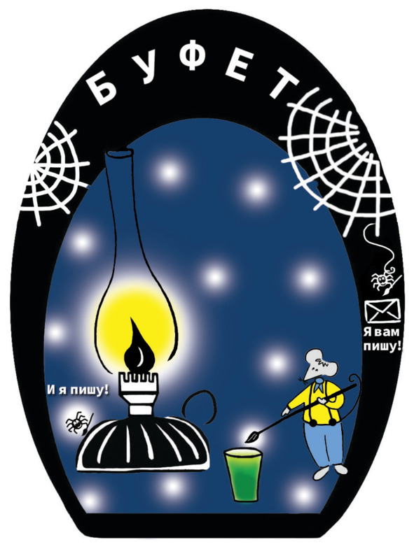 В доме уже все спали, почти все. В тёмной гостиной через приоткрытые дверцы буфета струился жёлтый свет. Это на полке горела керосиновая лампа. Здесь в окружении разноцветных тюбиков краски сидел мышонок Оладушек и усердно полоскал в стакане воды кисточки.