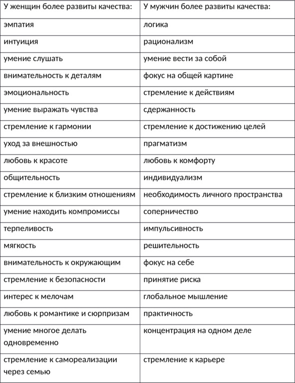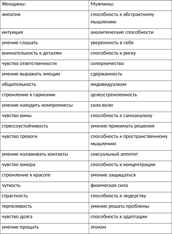Таблица 2. Психологические различия между женщинами и мужчинами, которые были отмечены в ходе моих исследований и наблюдений.