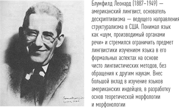Затем, когда к концу XIX в. обнаружился кризис исторического языкознания, стали активно сближать лингвистику с историей, психологией, физиологией, социологией и даже с географией. Но после появления книги Ф. де Соссюра начался длительный период нового, еще более радикального обособления лингвистики от всех наук (исключая лишь математику, сближение с которой науки о языке началось именно в этот период). Считалось, что лингвистика должна основываться исключительно на собственно лингвистических методах. Основатель ведущей американской лингвистической школы того времени, школы дескриптивистов, Леонард Блумфилд (1887–1949) утверждал, что предмет изучения лингвистики – «шум, производимый органами речи». Другой виднейший структуралист, датчанин Луи Ельмслев (1899–1965), писал в 1953 г.: «Лингвистика должна попытаться охватить язык не как конгломерат внеязыковых (т. е. физических, физиологических, психологических, логических, социологических) явлений, но как самодовлеющее целое». Представители разных школ структурной лингвистики сходились в том, что связь лингвистики с другими науками если и может быть, то лишь односторонней: другие науки могут и даже должны использовать результаты, полученные лингвистикой, но последняя от них совершенно независима.