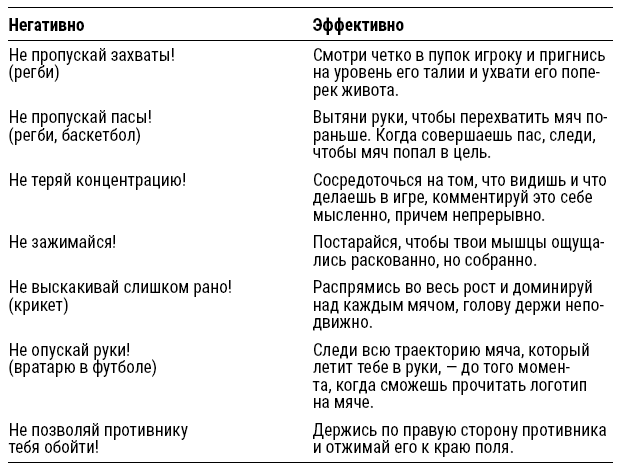 Если вы скажете: «Не упускайте пас», в мозгу игрока возникнет мысленная картинка, как он упускает пас, и только потом мозг осознает отрицание и указание не делать этого. Куда практичнее и полезнее сразу передавать игроку образ желаемой цели, а не образ того, чего надо избегать.