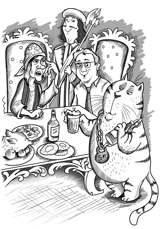 Под томительные звуки аргентинского танго вышел толстый полосатый Кот огромного роста с лоснящейся сытой мордой и небрежно выволок за собой массивную золотую цепь. При виде этой цепи Хорохорин почему-то непроизвольно покраснел и спрятал поглубже в карман руку с тоненьким обручальным колечком, которое очень любил выставлять напоказ и регулярно полировал специальной бархоткой. Следом за вальяжным артистом выскочил маленький котёнок с ноутбуком и целлофановым пакетом. Вывалив из пакета на край стола перед зрителями кучу сияющих перстней, ожерелий и сотовых телефонов, малыш быстро ускакал. Для пущей убедительности Кот извлёк из-за спины две большие блестящие гири, тоже, наверное, из золота, и дал одну из них подержать Петрушке. Тот, охнув, тотчас выронил её и поскорее скрылся от греха подальше.