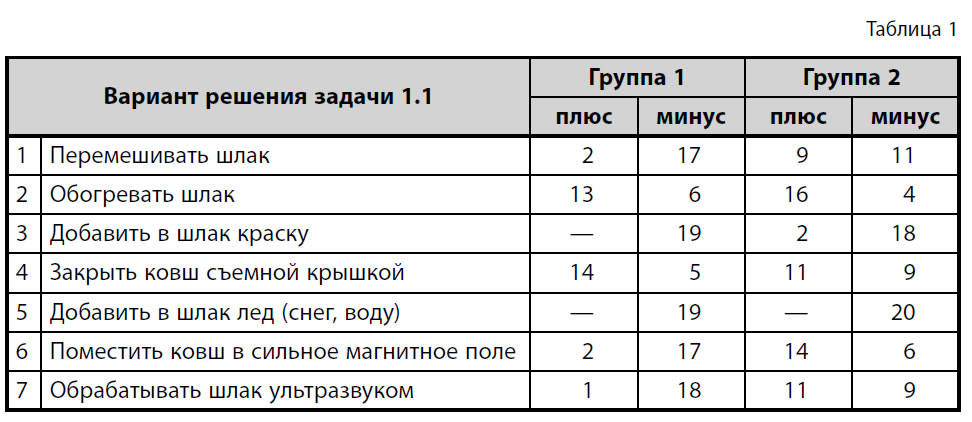 Слушатели получили листки с записью идеи решения. Требовалось отметить плюсами те варианты, которые представляются им подходящими или хотя бы заслуживающими проверки, и минусами – варианты, отвергаемые в принципе. В первой группе было 19 инженеров, в том числе 11 металлургов. Вторая группа включала 8 инженеров и 12 студентов; металлургов в группе не было. Результаты эксперимента приведены ниже: