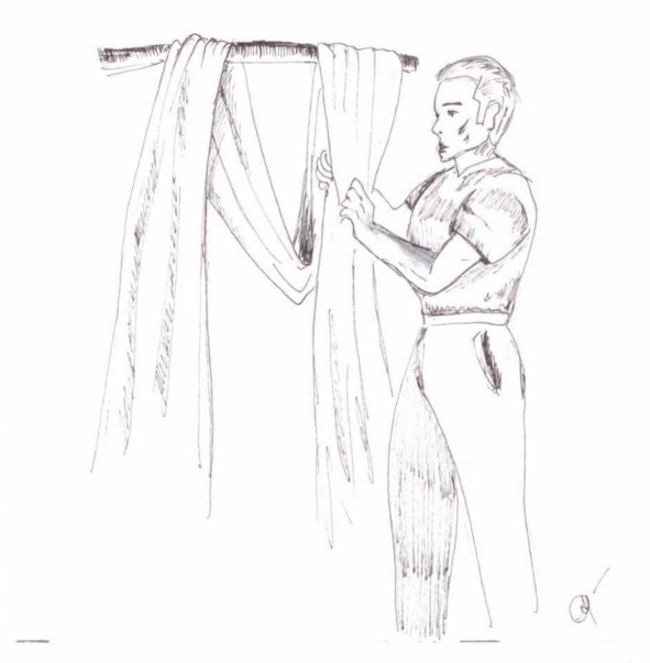 Высокий продавец-мужчина, раскладывая свой товар, достал из коробки длинную гардину. Идёт с ней вдоль прилавка, осматривается по сторонам и задумчиво говорит: