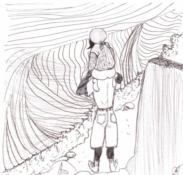 Парень улыбнулся и подошёл к скале. Я подумала, что он подаст мне руки и я, опершись на них, спрыгну. Но молодой человек повернулся ко мне спиной и показал рукой, чтобы я села верхом ему на шею.