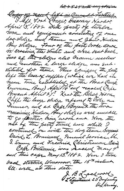 J. B. Lockwood2d Lieutenant 23d InfantryU.S. Army.Cobb then detailed all the circumstances attending the fit-out of the Greely expedition, and his personal acquaintance with Brainard and Lockwood. He narrated that they had reached this memorable spot on the 13th of May, 1882, and could go no farther, as a great sea washed the shore in front of them – the time being summer. Opening the letter which he had taken from the meat-can, he read to his astonished friends: