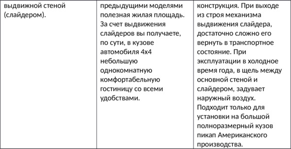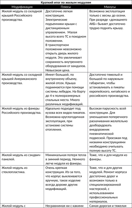 В эксплуатации такой жилой модуль очень похож (плюсы и минусы) на жилой прицеп. Огромным достоинством является то, что не требуется какой-либо регистрации в органах автоинспекции и на него не нужна никакая дополнительная страховка и категория прав при его транспортировке, т.к. он фактически является грузом. Так же плюсом является то, что имея жилой модуль для путешествий можно пользоваться им тогда, когда это нужно. И, естественно, он значительно расширяет возможности внедорожника, превращая его в мини дом на колесах, с качествами экспедиционными автомобиля. Минус – это небольшая жилая площадь (кроме модели со слайдерами), и, как, следствие очень стеснённые условия проживания. Но возможность «забраться» туда, куда не доедет ни один автодом с лихвой компенсирует все неудобства.