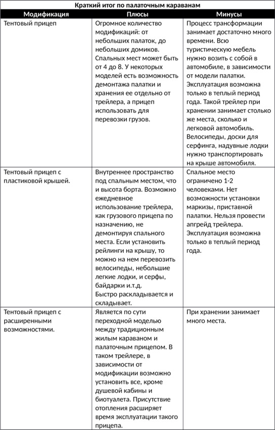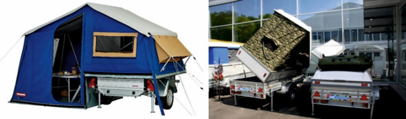 В варианте, где предусмотрена веранда, есть возможность организации дополнительного места для сна, установив раскладушку, которую привезли с собой в прицепе. Однако, в отличие от традиционного каравана, отсутствует санитарный блок с биотуалетом, душем и кухней. Но некоторые производители, за дополнительную плату, могут установить в трейлере ёмкость для воды, холодильник и газовые кухонные горелки. Существуют упрощенные варианты тентовых караванов, у которых пластиковая крыша точно такая же как на авто палатке, но большего размера, и которая закрывает весь прицеп. Механизм поднятия крыши такой же, как и у авто палатки, но при этом спальное место просто огромное. На пластиковый верх можно установить дополнительные рейлинги и перевозить на них спортивное снаряжение: велосипеды, доски для серфинга, легкие лодки. Кроме того, такой трейлер возможно использовать по своему прямому назначению – транспортировки груза, не снимая спального места, т.к. доступ в грузовой отсек осуществляется сбоку. К сожаления спальные места ограничены 1 -2 путешественниками. Поэтому такие трейлеры пользуются популярностью у рыбаков. Кстати, по запросу, смонтируют специальное внедорожное шасси.