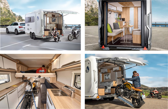 Единственным Европейским представителем каравана для перевозки техники является модель «Knaus Deseo Transport». Этот трейлер имеет огромную заднюю дверь – трап, которой нет ни в одном другом жилом прицепе, ни у одного производителя. Двойной усиленный каркас двери на массивных петлях, поддерживаемый огромными газовыми амортизаторами. Она герметизирована от пыли и грязи толстым резиновым уплотнителем, который является трапом для заезда техники и дает дополнительное место «под крышей», где можно спрятаться от палящего солнца или проливного дождя. А за отдельную плату производитель предлагает еще палатку от непогоды для этой двери (1,7 м х 1,86 м). В передней части каравана установлена компактная кухня, душевая кабина с комбинированным туалетом, и одно спальное место сзади, которое опускается сверху, если нет техники. Такой трейлер очень востребован любителями мотоспорта.