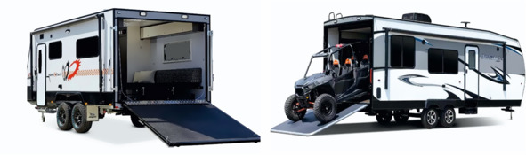 На Американском и Австралийском рынке жилых прицепов дела обстоят немного лучше, чем в Европе. Производителей, и соответственно выбор таких трейлеров очень большой. Но все они рассчитаны на транспортировку только тяжелым внедорожником. В отличии от Европы, такой караван разделен на два отсека: гараж для техники и жилая зона, которая оснащена с американским размахом. Полноразмерный холодильник, большая кухня, огромная душевая кабина, туалет, и, конечно, спальные места – все подчинено одному: комфортному отдыху в полевых условиях. На борту имеется не только газовое оборудование, большой запас воды, но и встроенный генератор с рабочим выходным напряжением бортовой сети 110В / 60Гц. Эти трейлеры оснащены электрическими тормозами, с блоком управления, установленным внутри тягача. Если вам необходим караван с возможностью перевозки АТВ (квадроцикла) или снегоход для соревнований, то это будет правильный выбор.