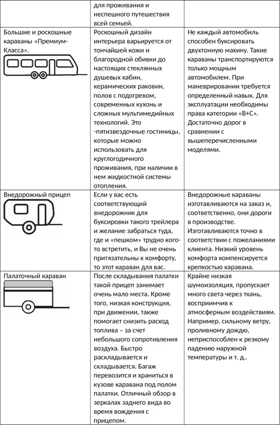 В предыдущей главе мы рассмотрели туристическое оборудование, которое возможно установить в (или) на автомобиль, не требующих никаких дополнительных действий для получения прав управления автомобилем соответствующей категории или дополнительных навыков вождения. Далее рассмотрим вариант прицепа – фургона, который буксируется специально дооборудованным транспортным средством (тягачом), в то время как описанные выше туристические ТС, передвигаются сами.2