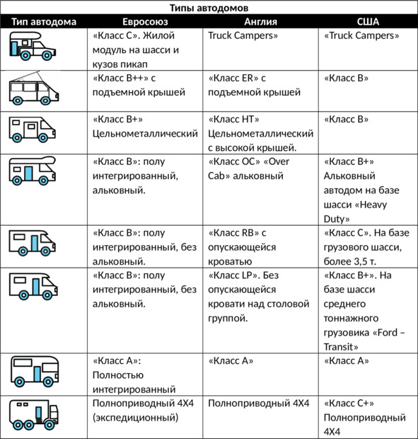 В настоящее время на Европейском рынке существует основных четыре класса автодомов: «класс A», «класс B», «класс B+» и «класс C». Отдельно можно выделить «класс В++» – это цельнометаллические фургоны с поднимающейся крышей. Заметим, что дома на колесах «класса B» стали наиболее популярными в последнее десятилетие. Каждый класс имеет свои достоинства и недостатки.
