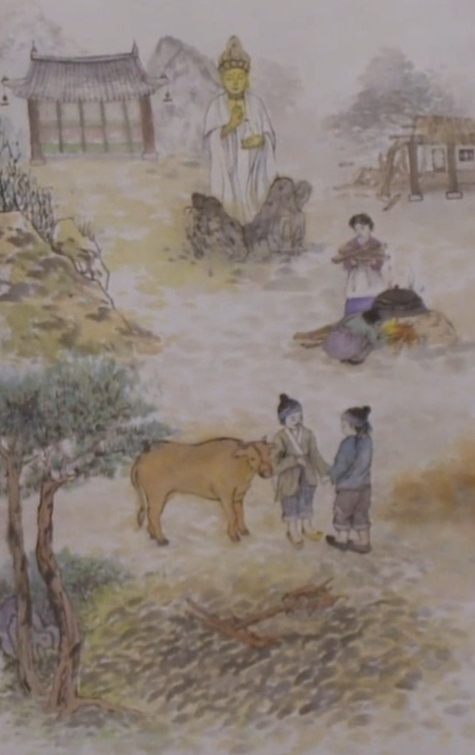 – На этой картине нет припасенных дров для костра, вместо них женщина разобрала свою хижину. А крестьянин продаёт свою единственную корову, а на заднем плане статуя «Будды». «Продам вола, чтобы заплатить налог, и мысли про голод будут счетно гнать, речному «богу» я стану женой» Это строки из стихотворения Су Ши «Печаль крестьянки»
