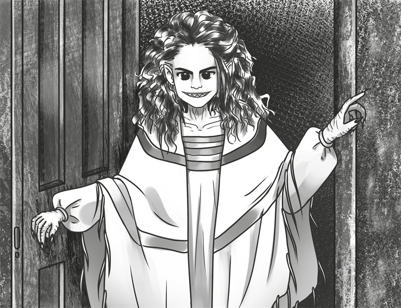 Резко отсмеявшись, колдунья улыбнулась одной стороной рта. Под ней снова блеснули тонкие клыки. Дети, стоящие на лестнице, мгновенно спустились с деревянных ступенек на площадку последнего этажа.