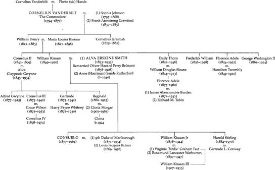 AS THE DELAY LENGTHENED and nervousness grew, self-appointed society experts in the crowd had time to debate one important question: had anyone seen the Vanderbilt family, whose apotheosis this was alleged to be? There could be no dispute that Vanderbilt gold was a powerful chemical element at work in St Thomas Church on 6 November 1895. It had given the bride her singular aura; it had drawn a duke from England; and without it, Alva would not now be waiting anxiously for her daughter to arrive. Scintillae of Vanderbilt gold dust brushed everything on the morning of Consuelo’s wedding, from the fronds of asparagus fern to the glinting lorgnettes in the crowd outside. It was remarkable, therefore, that apart from the father-of-the-bride, its chief purveyors should be so conspicuously absent; and even more striking that this scarcely mattered because of the force of character of the bride’s Vanderbilt great-grandfather, whose ancestral shade still hovered over the players in the morning’s drama as if he were alive.