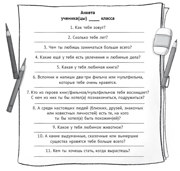 – Кроме того, – продолжала учительница, пока мы разглядывали анкеты, – ваши ответы очень пригодятся для следующих классных часов. О том, как они будут проходить, я расскажу вам на следующей неделе, но обещаю, что будет очень интересно! А теперь приступайте к заполнению.