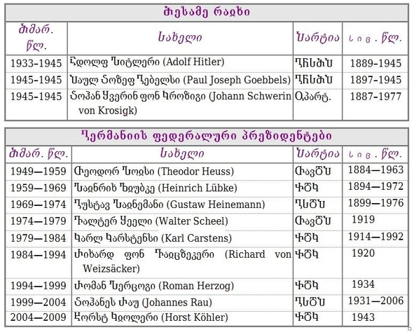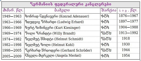 Adenauer Konrad (Ⴀდენაუერი Ⴉონრად, 1876—1967 წწ.) – Ⴂერმანიის ფედერალური კანცლერი 1949—1963 წწ.; 1946—1966 წწ. – ႵႣႩ თავჯდომარე; მის სახელთანაა დაკავშირებული ქვეყნის ეკონომიური აღორძინება Ⴋეორე მსოფლიო ომის შემდეგ.
