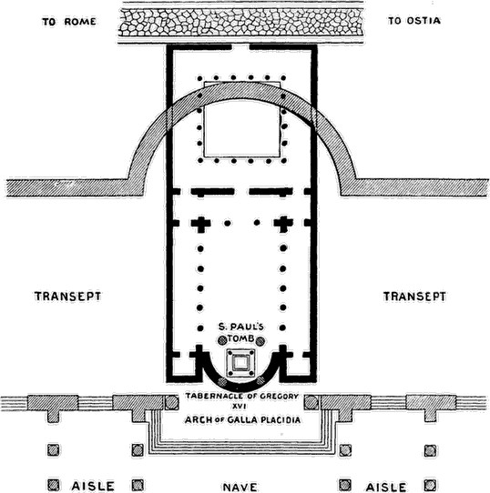 In 386 Valentinian, Theodosius, and Arcadius asked Flavius Sallustius, prefect of the city, to submit to the Senate and the people a scheme for the reconstruction a fundamentis of the basilica, so as to make it equal in size and beauty to that of the Vatican. To fulfil this project, without disturbing either the grave of the apostle or the road to Ostia, there was but one thing to do; this was to change the orientation of the church from east to west, and extend it at pleasure towards the bank of the Tiber. The consent of the S. P. Q. R. was easily obtained, and the magnificent temple, which lasted until the fire of July 15, 1823, was thus raised so as to face in a direction opposite to the usual one.