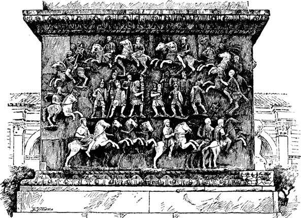 Meanwhile proposals were made and resolutions passed in the Senate, which went far beyond anything that had ever been suggested in such contingencies of state. One of the members recommended that the statue of Victory which stood in the Curia should be carried before the hearse, that lamentations should be sung by the sons and daughters of the senators, and that the pageant, on its way to the Campus Martius, should march through the Porta Triumphalis, which was never opened except to victorious generals. Another member suggested that all classes of citizens should put aside their golden ornaments and all articles of jewelry, and wear only iron finger-rings; a third, that the name of "August" should be transferred to the month of September, because the lamented hero was born in the latter and had died in the former. These exaggerated expressions of grief were suppressed, however, and the funeral was organized with the grandest simplicity. The body was placed in the Forum, in front of the Temple of Julius Cæsar, from the rostra of which Tiberius read a panegyric. Another oration was delivered at the opposite end of the Forum by Drusus, the adopted son of Tiberius. Then the senators themselves placed the bier on their shoulders, leaving the city by the Porta Triumphalis. The procession formed by the Senate, the high priesthood, the knights, the army, and the whole population skirted the Circus Flaminius and the Septa Julia, and by the Via Flaminia reached the ustrinum, or sacred enclosure for cremation. As soon as the body had been placed on the pyre the "march past" began in the same order, the officers and men of the various army corps making their evolutions or decursiones. This word, taken in a general sense, means a long march by soldiers made in a given time and without quitting the ranks; when referring to a funeral ceremony it signifies special evolutions performed three times, in honor of distinguished generals. A decursio is represented on the base of the column of Antoninus Pius, now in the Giardino della Pigna. In that which I am describing, officers and men threw on the pyre the decorations which Augustus had awarded them for their bravery in battle. The privilege of setting fire to the rogus was granted to the captains of the legions whom he had led so often to victory. They approached with averted faces, and, uttering a last farewell, performed their act of duty and respect. The cremation accomplished, and while the glowing embers were being extinguished with wine and perfumed waters, an eagle rose from the ashes as if carrying the soul of the hero to Heaven. Livia and a few officers watched the place for five days and nights, and finally collected the ashes in a precious urn, which they placed in the innermost crypt of the mausoleum which Augustus had built in the Campus Martius forty-two years before.