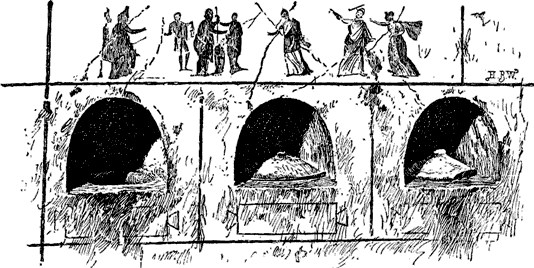 Proceeding on our pilgrimage towards the Clivus Cinnæ, the ascent to the Monte Mario, we have to record a line of tombs discovered by Sangallo in building the fortifications or "Bastione di Belvedere." One of them is thus described by Pirro Ligorio on p. 139 of the Bodleian MSS. "This tomb [of which he gives the design] was discovered with many others in the foundations of the Bastione di Belvedere, on the side facing the Castle of S. Angelo. It is square in shape, with two recesses for cinerary urns on each side, and three in the front wall. It was gracefully decorated with stucco-work and frescoes. Next to it was an ustrinum where corpses were cremated, and on the other side a second tomb, also decorated with painted stucco-work. Here was found a piece of agate in the shape of a nut, so beautifully carved that it was mistaken for a real nutshell. There was also a skeleton, the skull of which was found between the legs, and in its place there was a mask or plaster cast of the head, reproducing most vividly the features of the dead man. The cast is now preserved in the Pope's wardrobe."130