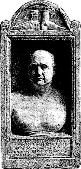 Finally, I shall mention the tomb of a boot and shoe maker, which was discovered February 5, 1887, in the foundations of one of the new houses at the foot of the Belvedere. This excellent work of art, cut in Carrara marble, shows the bust of the owner in a square niche, above which is a round pediment. The portrait is extremely characteristic: the forehead is bald, with a few locks of short curled hair behind the ears; and the face shaven, except that on the left of the mouth there is a mole covered with hair. The man appears to be of mature age, but healthy, robust, and of rather stern expression.