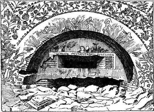 The entrance to the crypt, discovered in 1714 and again in 1865, near the farmhouse of Tor Marancia, at the first milestone of the Via Ardeatina, is hewn out of a perpendicular cliff, which is conspicuous from the high road (the modern Via delle Sette Chiese). The crypt is approached through a vestibule, which was richly decorated with terra-cotta carvings, and, on the frieze, a monumental inscription enclosed by an elaborate frame. No pagan mausolea of the Via Appia or the Via Latina show a greater sense of security or are placed more conspicuously than this early Christian tomb. The frescoes on the ceiling of the vestibule, representing biblical scenes, such as Daniel in the lions' den, the history of Jonah, etc., were exposed to daylight, and through the open door could be seen by the passer. No precaution was taken to conceal these symbolic scenes from profane or hostile eyes. We regret the loss of the inscription above the entrance, which, besides the name of the owner of the crypt, probably contained the lex monumenti, and a formula specifying the religion of those buried within. In this very catacomb, a few steps from the vestibule, an inscription has been found, in which a Marcus Aurelius Restitutus declares that he has built a tomb for himself and his relatives (sibi et suis), provided they were believers in Christ (fidentes in Domino). Another tombstone, discovered in 1864, in the Villa Patrizi, near the catacombs of Nicomedes, states that none might be buried in the tomb to which it was attached except those who belonged to the creed (pertinentes ad religionem) of the founder.