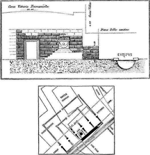 The drawings which illustrate my account of the discovery45 prove that the altar rose from a platform twelve feet square, approached on all sides by three or four marble steps, that platform and altar were enclosed by three lines of wall at an interval of thirty-six feet from one another, and that on the east side of the square ran a euripus, or channel, eleven feet wide, and four feet deep, lined with stone blocks, the incline of which towards the Tiber is about 1:100. This last detail proves that when the rough altar of Volesus Sabinus was succeeded by the later noble structure, the pool was drained, and its feeding springs were led into the euripus, so that the patients seeking a cure for their ailments could bathe in or drink the miracle-working waters with greater ease. No attention whatever was paid to the discovery at the time it took place. Instead of reaching the ancient level, the excavation for the main sewer of the Corso Vittorio Emanuele was stopped at the wrong place, within three feet of the pavement; consequently whatever fragments of the altar, of inscriptions, or of works of art, were lying on the marble floor will lie there forever, as the building of the palaces on either side of the Corso, and the construction of the Corso itself, with its costly sewers, sidewalks, etc., have made further research impossible, at least with our present means.