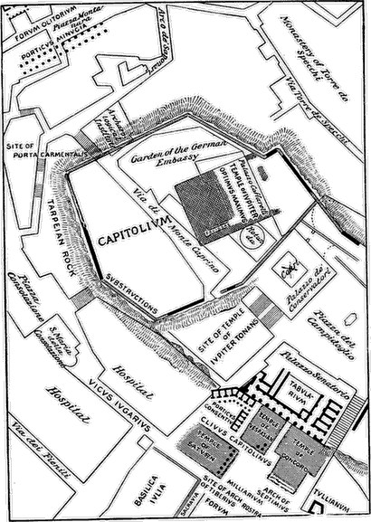 Let us now turn our attention to more imposing structures. The first temple in the excavation of which I took part was that of Jupiter Optimus Maximus on the Capitoline Hill.48 Its discovery was due more to an intuition of the truth, than to actual recognition of existing remains. On November 7, 1875, while digging for the foundation of the new Rotunda in the garden which divides the Conservatori palace from that of the Caffarellis,—the residence of the German ambassador,—our workmen came upon a piece of a colossal fluted column of Pentelic marble, lying on a platform of squared stones, which were laid without mortar, in a decidedly archaic style. Were we in the presence of the remains of the famous Capitolium, or of one of the smaller temples within the Arx? To give this query a satisfactory answer, we must remember that the Capitoline Hill had two summits, one containing the citadel, or Arx, the other the Temple of Jupiter Optimus Maximus, the Capitolium. Ancient writers never use the two names promiscuously, or apply them indifferently to either summit or to the whole hill. The name of the hill is the Capitoline; not the Capitol, which means exclusively the portion occupied by the great temple. Suffice it to quote Livy's evidence (vi. 20), ne quis in Arce aut Capitolio habitaret, and also the passage of Aulus Gellius (v. 12) in which the shrine of Vedjovis is placed between the Arx and the Capitolium.