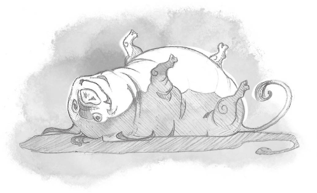 »Und ich erst«, bestätigt Mona und tätschelt das Schwein. Das wird im selben Moment von Müdigkeit überwältigt und plumpst seufzend auf die Seite.