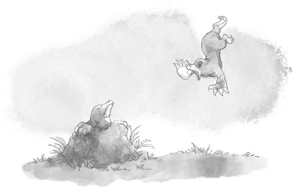 Er nickt Rapos zu. Und was jetzt kommt, wird für immer das Unglaublichste bleiben, das je seinen Weg ins Unglaubliche Notizbuch gefunden hat: Rapos hebt seinen Stab und murmelt etwas. Ein Blitz feuert heraus. Mona und Jackie schreien erschrocken auf. Unter den Fellpranken des Bootshauses rumpelt die Erde bedrohlich. Das Haus wimmert ängstlich. Im nächsten Moment wachsen drei, vier, viele Maulwurfshaufen aus dem Boden. Überall auf dem Acker. Heraus schießen in hohem Bogen Maulwürfe. Lila Maulwürfe! Sobald sie wieder Boden unter ihren Bäuchen haben, graben sie sich zornig fiepsend in die Erde zurück. Mona und Jackie starren auf das Gewusel.