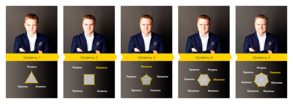 На втором уровне в компетенции ресурс-менеджера добавляется еще и зона процессов. Будучи главой отдела или виртуального пула, он выстраивает процессы и влияет на них. Он может создавать и изменять бизнес-процессы, по меньшей мере затрагивающие производство. Таким образом, RM создает и внедряет правила, из которых понятно, как поступать в тех или иных случаях, и высвобождает свое управленческое время, участвуя в вопросе загрузки специалистов лишь ситуативно.
