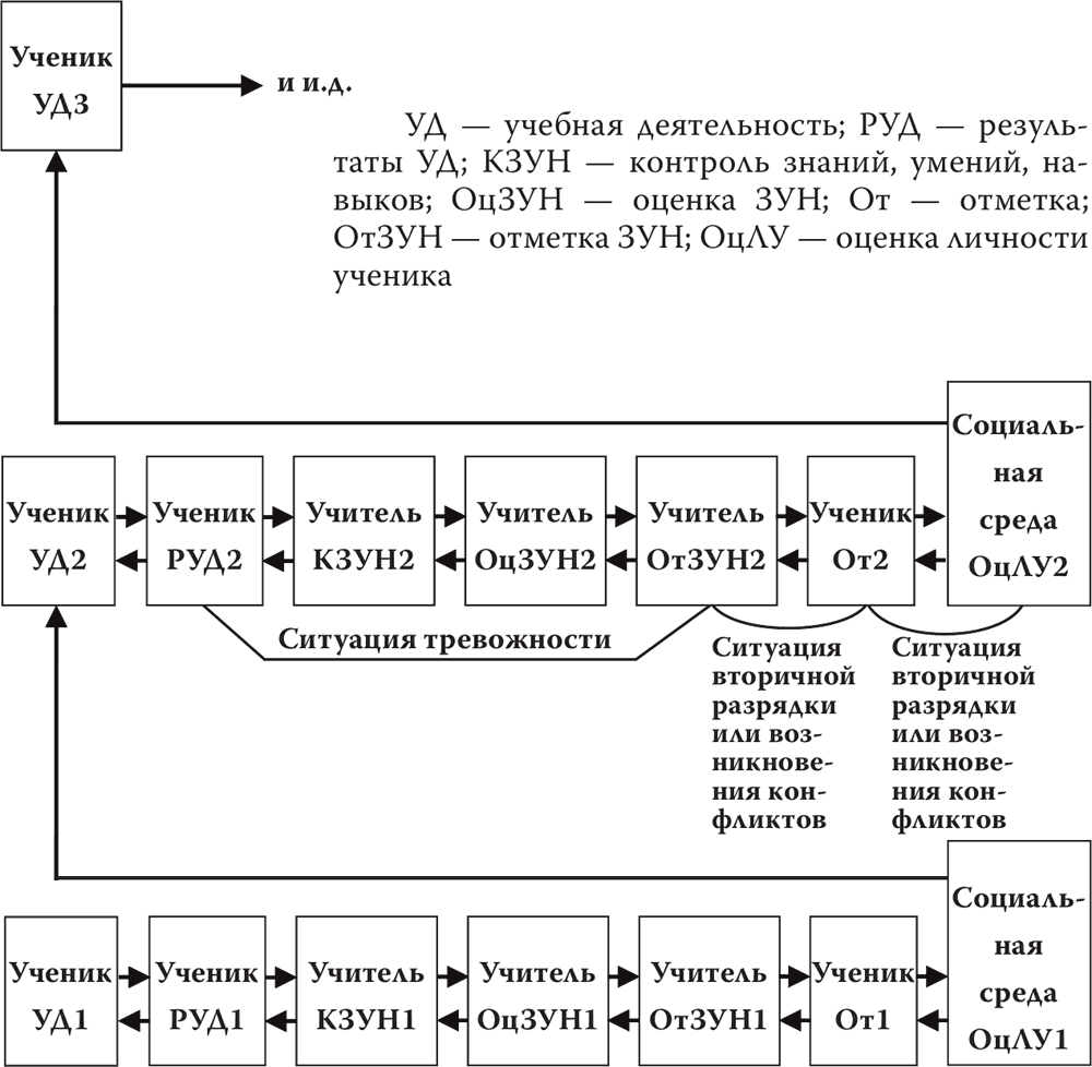 Попытаемся придать содержательный смысл начальному циклу этой схемы. С целью усвоения определенного учебного материала ученик осуществляет учебную деятельность УД1 (на уроке и при выполнении домашних заданий), в которой в большей или меньшей степени проявляет старание и усердие, определенные знания и умения, учится ориентироваться и оперировать соответствующими способами деятельности с предметом.