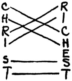 Not until the list is completed does the class see that its initial letters spell David's name. You have attained the element of surprise, so valuable in work of this sort. Again, in a lesson on the rich young man, or on Dives and Lazarus, or on Zaccheus, write in a vertical column the letters of Christ's name, and draw straight lines to the right in various directions, as shown in the following diagram. Transferring the letters, or getting some scholar to transfer them, to the points indicated, you quickly insert an E, and it reads: "Christ—richest."