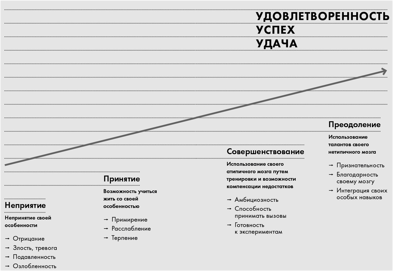 Важное замечание: определить, насколько успешным вас сделает ваш нетипичный мозг, можно и по другим факторам. Примером является ваше социальное окружение или ваш уровень образования. Еще одним важным фактором является IQ. IQ ниже 70 указывает на заметное ухудшение интеллектуальных способностей. Наши рассуждения в книге не относятся к этой конкретной группе, книга предназначена для другой аудитории – людей со средним IQ и выше. Кроме того, книга не предназначена для людей, чье состояние настолько влияет на качество жизни, что они не могут заниматься профессиональной деятельностью.