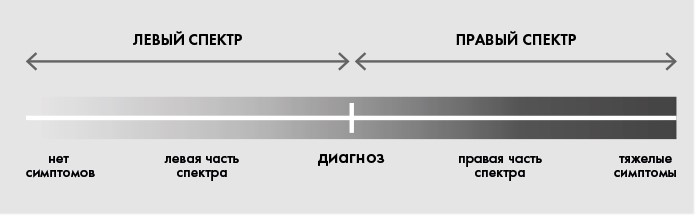 Эта часть спектра находится справа от состояния, в котором обычно ставят диагноз. Здесь симптомы уже ярко выражены и есть место диагнозу. Чем дальше вправо, тем выше вероятность, что симптомы будут препятствовать нормально жить и работать. Эта часть спектра обычно становится предметом исследований и темой книг о нейроразнообразии.
