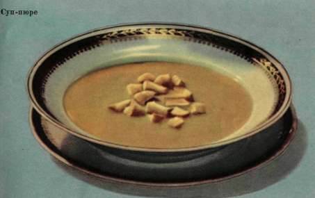 К супам-пюре подают отдельно подсушенные гренки из пшеничного хлеба, нарезанного мелкими кубиками (20 г на порцию), или кукурузные, или пшеничные хлопья, или пирожки.