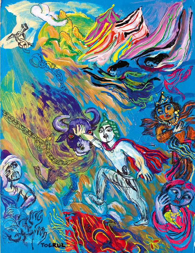 Вдруг один из молодых джигитов – парень лет семнадцати – в мгновение ока выскочил вперед, встал перед быком, преградил ему путь, ударил быка кулаком по лбу. Бык остановился как вкопанный. Потом отступил назад и со всей силы кинулся на парня. На этот раз юноша уперся кулаком в бычий лоб. И так оба застыли. Бык не мог одолеть парня, парень быка. У парня взбухли жилы. Бык был сильнее. Вдруг парень убрал кулак и отскочил в сторону. Бык не удержался на ногах, упал на рога. Не упустив минуты, парень выхватил нож и отсек быку голову.