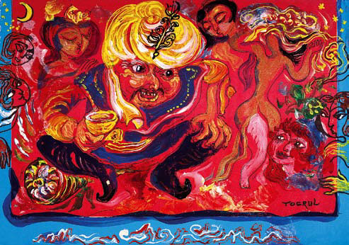 Трон Кыпчак Мелика помещался на высоком помосте. Помост был очень широкий. Здесь был и трон Кыпчак Мелика, и его ложе. На этом помосте, кроме самого Кыпчак Мелика, было еще девять черноглазых, светлолицых, длиннокосых красавиц. Руки их до запястий были выкрашены хной, пальцы тонкие, шеи длинные. Кыпчак Мелик веселился с ними. Девушки подавали ему вино в золотых кубках.