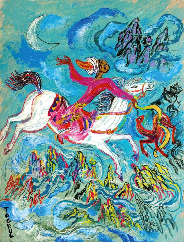 Когда задули прохладные рассветные ветры, запели сереброгорлые жаворонки, заржали бедуинские кони, когда было не темно и не светло, когда солнце едва коснулось прекрасных гор, Бейрек встал, сел на своего Серого жеребца, выехал на охоту.