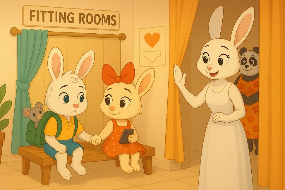 Мама зашла в магазин одежды, чтобы примерить одно красивое платье. Она отвела малышей в соседнюю пустую примерочную: