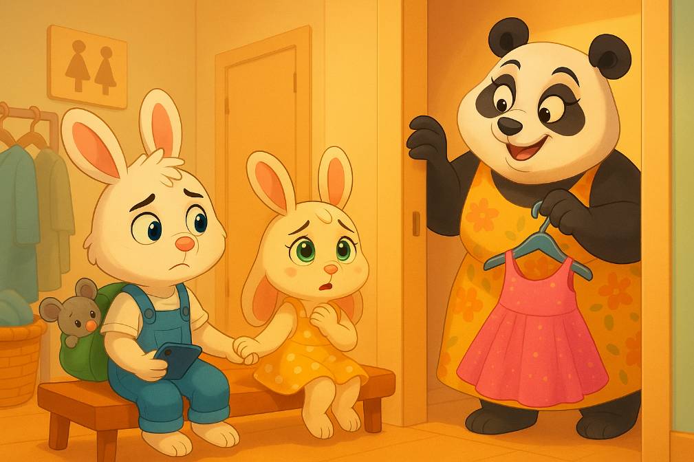 Зайчата сидели тихо и играли на мамином телефоне. Вдруг дверь их примерочной приоткрылась. Вошла улыбчивая тётя-панда. Она пахла духами и была очень вежливой.
