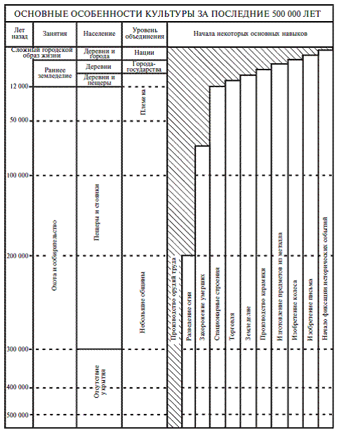 Временные перспективыС момента, когда обезьяночеловек сделал свои первые орудия труда, до того времени, когда человек стал записывать свою историю, в его жизни произошло множество перемен. Получая новый опыт, он обогащал свое наследие, а накапливая культурные навыки, смог сформировать свой характер и сущность. Небольшие группы первобытных людей постепенно превратились в общины, объединившиеся позднее в племена. К моменту появления ранних городских поселений они превратились в отдельные группы кровных родственников.
