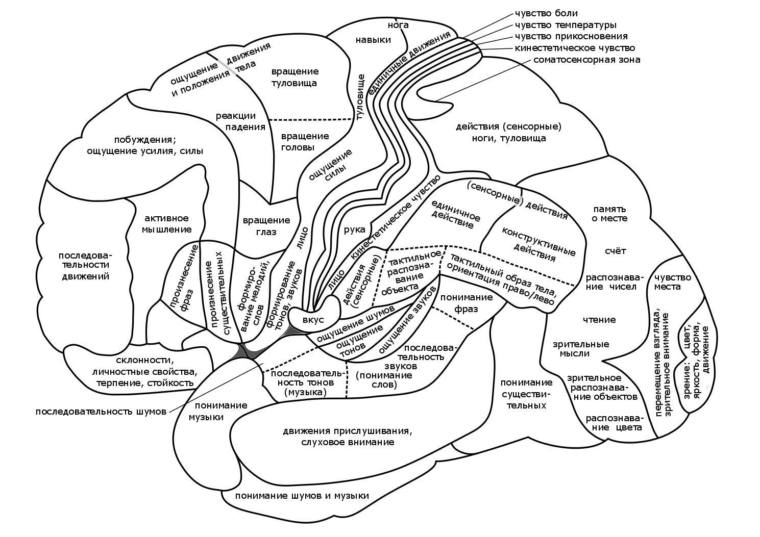 То есть, нейроны передают на органы зрения динамичную картинку, кожа синхронно с картинкой получает тактильные и температурные ощущения, мышцы и связки имитируют сложные движения, обоняние – иллюзию запаха, и так далее73. И знаменитые поля Бродмана74 – это не центры по формированию впечатлений и интеллектуальных возможностей, а узкопрофильные сообщества специалистов по их передаче Телу.