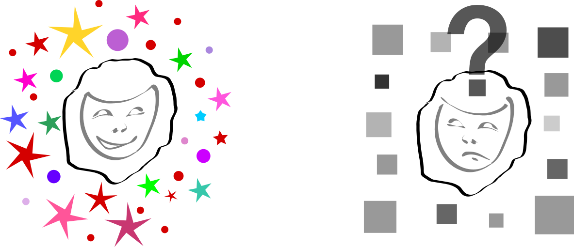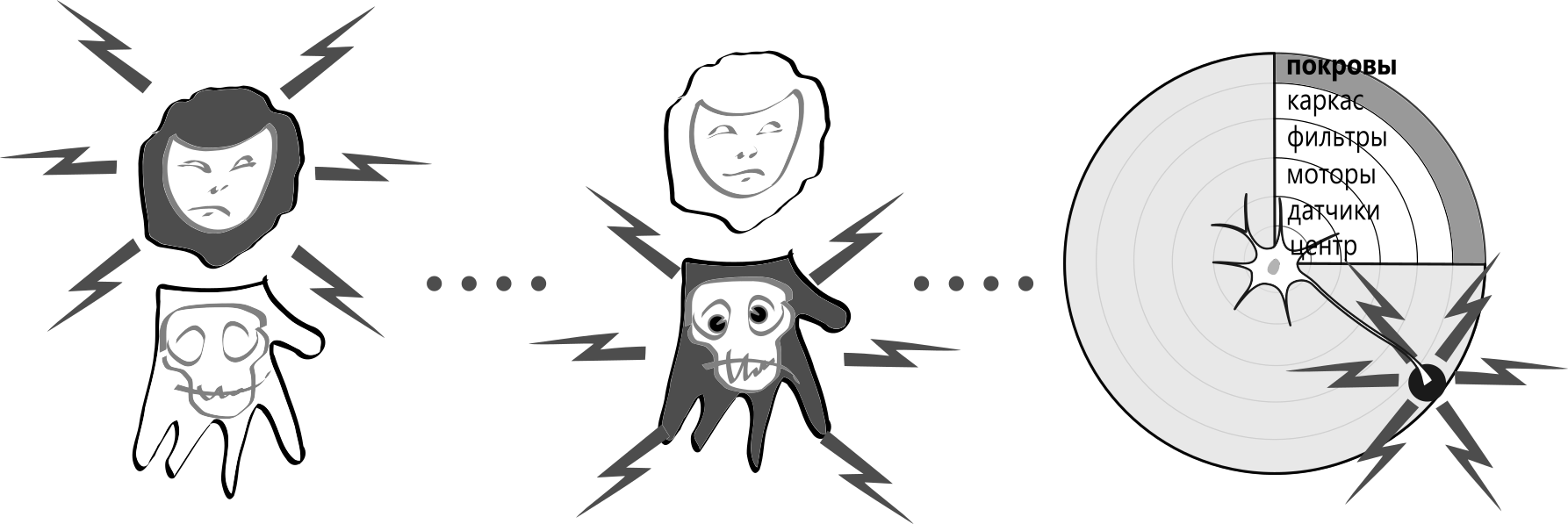 Первый сегмент – это способность построения виртуальных образов, конструкций и связей между ними на основе любых данных. Это могут быть а) элементарные образы, находящиеся в фокусе внимания97, б) иллюзорные впечатления, которые посылают нам нейроны98, в) готовые конструкции и образы в виде понятий или смысловых эквивалентов99, г) воспоминания, д) эмоциональные реакции, е) даже дефицит данных100, и так далее.