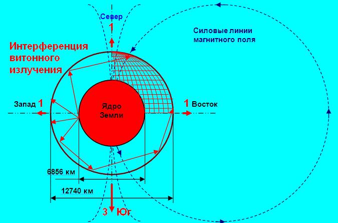Биологическое (витонное по Бабикову Ю.А. или микролептонное по Охатрину А.Ф.) излучение тоже подобно световому излучению сферической волны электронного излучения (света), однако его скорость в нашем пространстве 4С (четыре скорости света). Если представить, что луч света запустили внутрь полупрозрачной и частично отражающей сферы с длиной окружности 40.000 км, то луч света за секунду успеет 7,5 раз, а витонного излучения 30 раз обежать эту сферу, многократно испытывая преломление и интерференцию излучения. Поскольку это сфера, и свет идёт во всех направлениях, вдоль и поперёк, то рано или поздно всё излучение придет в равновесное состояние, при котором его интерференционная картина на внутренней сфере коры Земли даст СЕТКУ «СТОЯЧИХ» ВОЛН ИЗЛУЧЕНИЯ.