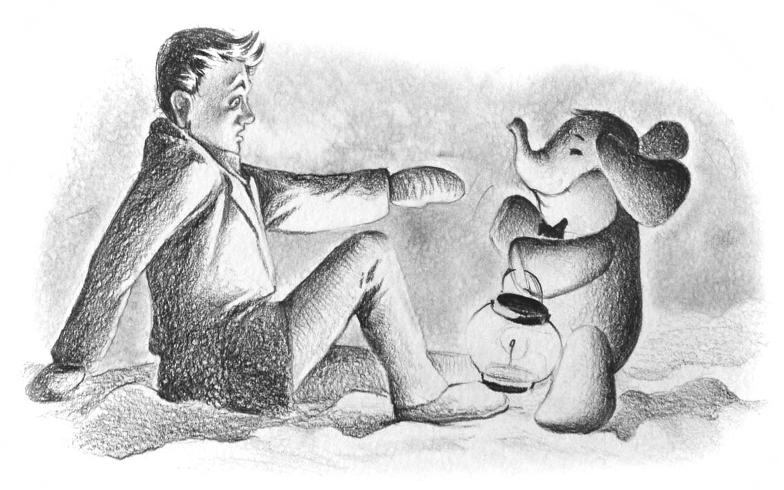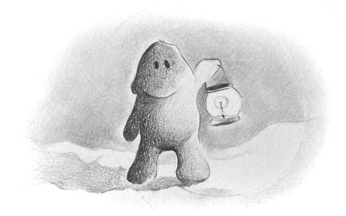 И действительно, сквозь пелену снегопада пробивался мягкий свет, постепенно приближаясь всё ближе, и ближе. Затем послышался шорох снега – явно звук шагов. Кто-то шёл ему навстречу. Казалось, прошла целая вечность прежде чем фигура таинственного гостя приблизилась к нашему несчастному герою. Он ожидал увидеть кого угодно – спасателя, медведя, лесника, или даже лешего, в конце-то концов! Но, никак не слонёнка. Да, без сомнений! Самый настоящий слонёнок, правда, плюшевый. Маленький, серый, с элегантной чёрной бабочкой.
