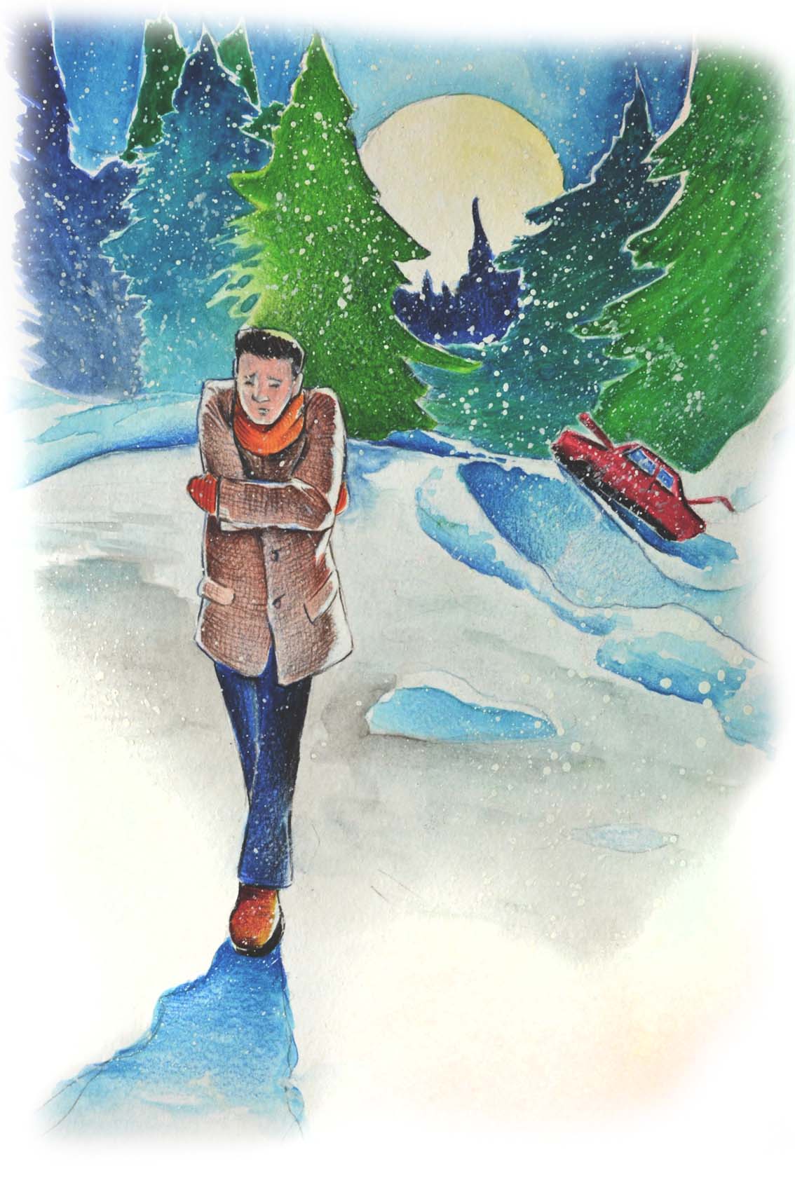 Это был холодный, зимний вечер, накрывший сумраком густой лес. Зигзагообразная дорога разделяла чащу, теряясь за горизонтом. По этой дороге мчался небольшой, но весьма резвый автомобиль. Человек, сидевший за рулём, искренне полагал, что его дело не может ждать, и поэтому выжимал из мотора последние остатки лошадиных сил. Он был молод, но измождённое лицо и мешки под глазами, как следствие бессонных ночей, – грозили стать ему постоянными спутниками и заметно старили черты. Да. Это был по-настоящему взрослый человек. Автомобиль мчался сквозь лес, и, казалось, ничто не могло его остановить. Но метель постаралась на славу, надёжно спрятав самые коварные и скользкие участки дороги. Неверное движение на повороте, занос, лязг тормозов, и вот уже на полной скорости автомобиль летит в глубокий овраг, набитый свежим декабрьским снегом. К великой удаче, водитель остался цел и невредим. Полный досады и злости, он выкарабкался из сугроба и задумался. Попробовал завести двигатель, но тщетно, кажется, что-то серьёзно поломалось.