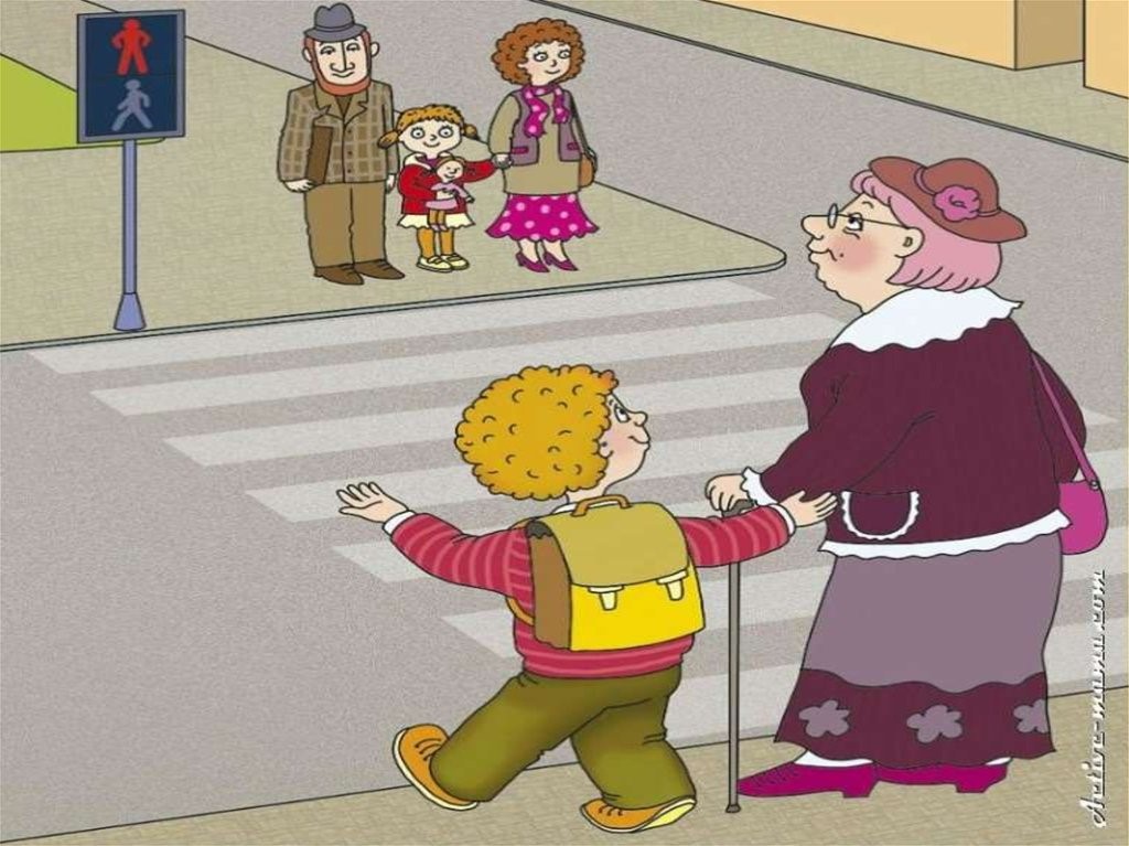 Идёт он дальше. И опять непорядок на улице! Старушка подслеповатая у перехода замешкалась и всё норовит с тротуара на проезжую часть ступить. А когда красный зажёгся, она и шагнула.