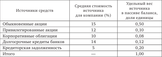 Устанавливают ССК как средневзвешенную величину индивидуальных стоимостей (цен), в которые обходится компании привлечение различных источников средств: